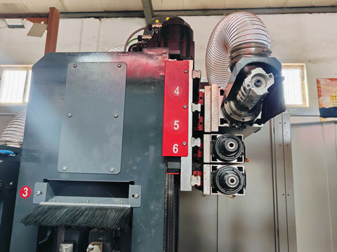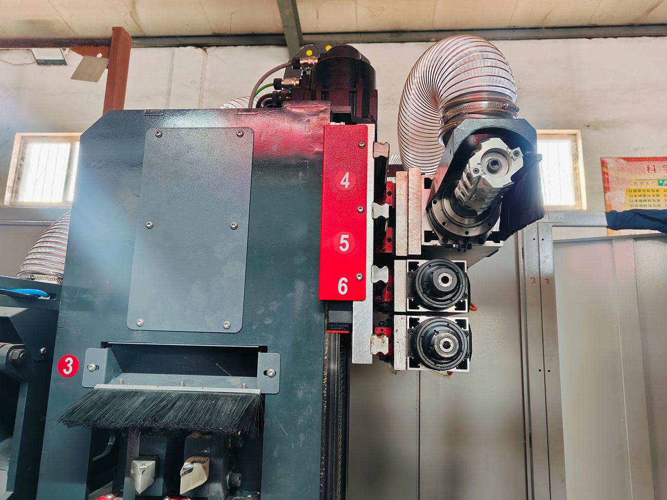 四軸6工序車銑復合加工中心,自動上料、自動打磨、雙刀車木、3個主軸電機(其中1個7.5KW光桿主軸電機帶動螺旋銑刀,另外2個小主軸電機可根據需求安裝不同功能刀具進行加工)。可車圓、銑型、拉槽、打孔、打磨等功能一次成型,適用于實木桌椅腿、沙發腿 、床腿、各種實木家具腿、樓梯木欄桿等旋轉木制品的加工。