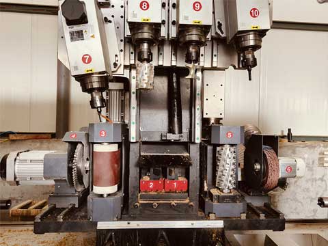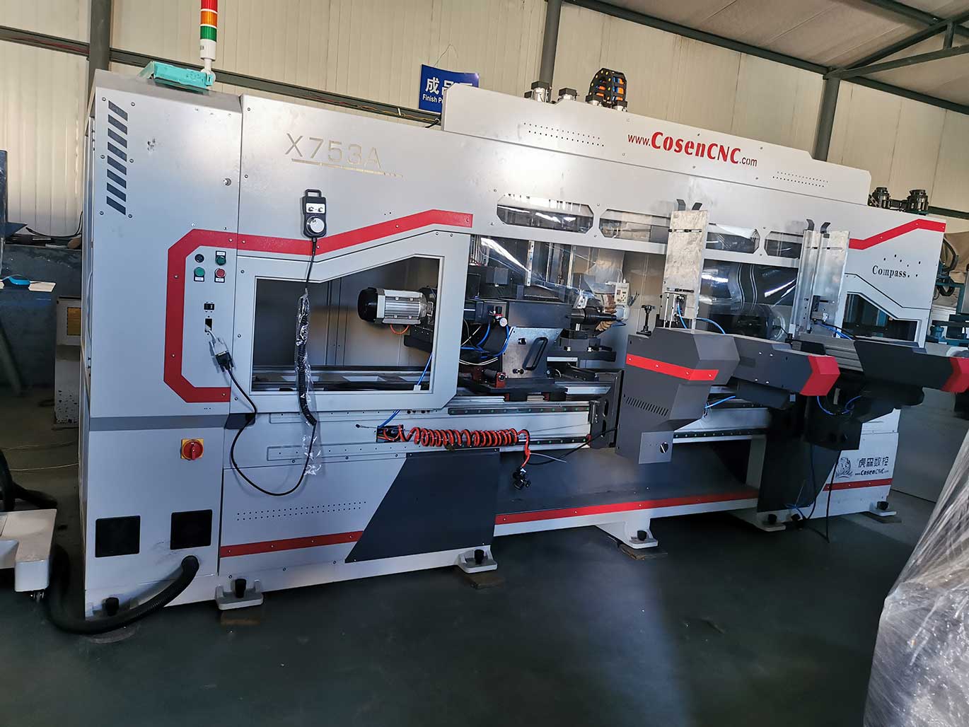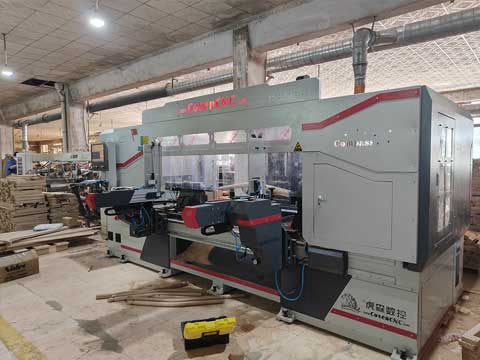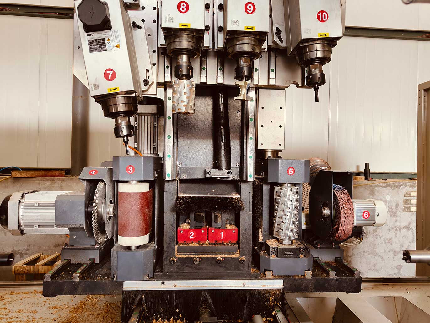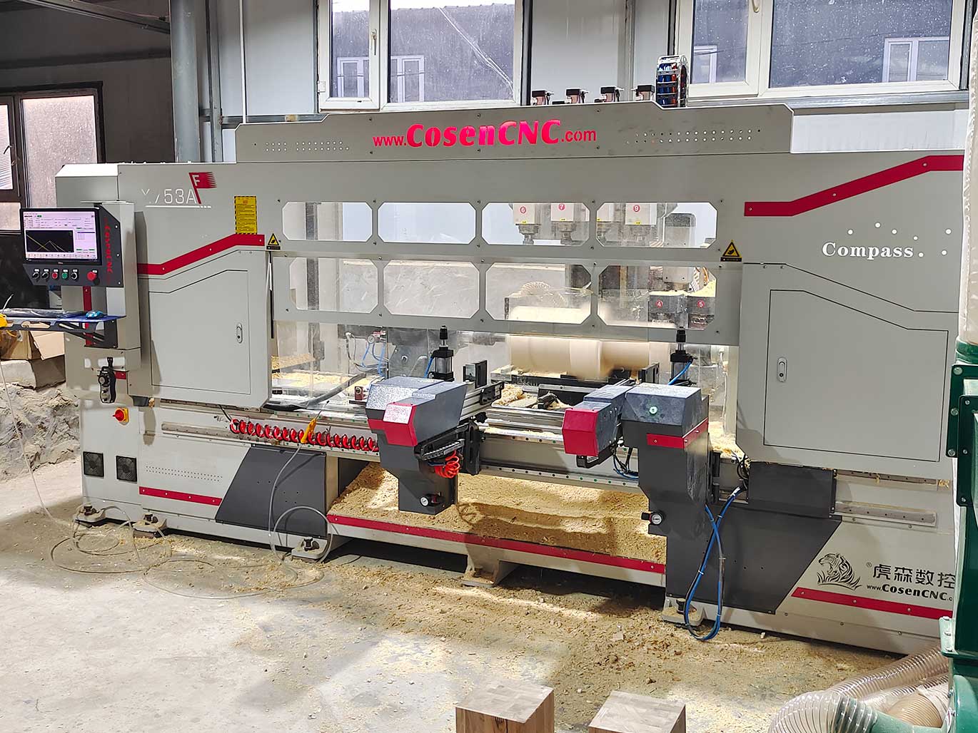 設備特點:這是一款四軸10工序車銑復合加工中心,可實現自動上料、雙刀車木、立柱刨銑、圓砂打磨、鋸片大吃刀量切削、四工序主軸(可實現打孔、倒角、拉線、榫槽、榫孔、鏤空、雕刻等功能,兩側主軸電機可手動調整角度實現15度以內斜孔加工),此型號設備功能更多,配置更齊全,適合加工更加復雜的工件,如臺球桌腿、異形復雜實木家具工件、實木家具腿等一次成型。